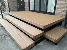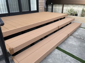お孫さんが遊べるスペースをお庭に作りたいと ウッドデッキと目隠しフェンスのご依頼です。ウッドデッキデッキは床下が見えにくい様に段床仕様で 片側には独立タイプのステップ施工。目隠しフェンスで外からの目線も遮り お孫さんとの楽しい時間を過ごしていただけたらと思います。